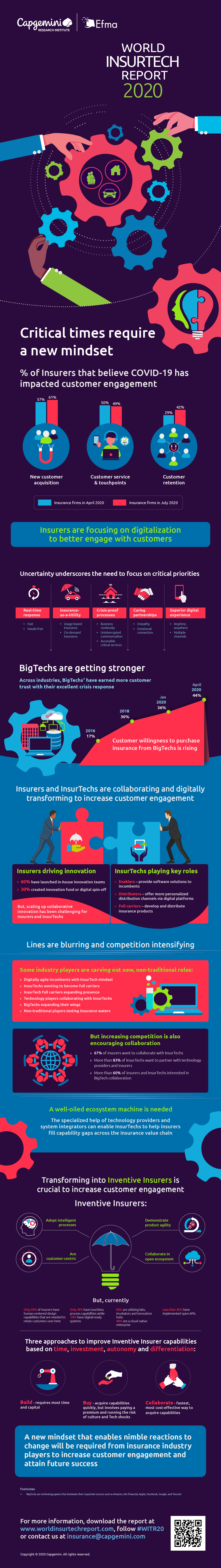 World InsurTech Report 2020 : qui sont Capgemini et l’Efma ?Capgemini est une entreprise spécialisée dans le conseil pour la transformation numérique. Elle accompagne ses clients, les aide à prendre en main et à implémenter des solutions telles que le cloud et les plateformes numériques. L’Efma – pour European Financial Management Association – est une organisation internationale à but non lucratif fondée dans les années 1970 par des acteurs de la banque et de l’assurance. L’organisation dit travailler à la mise en relation des décideurs et encourager la recherche.